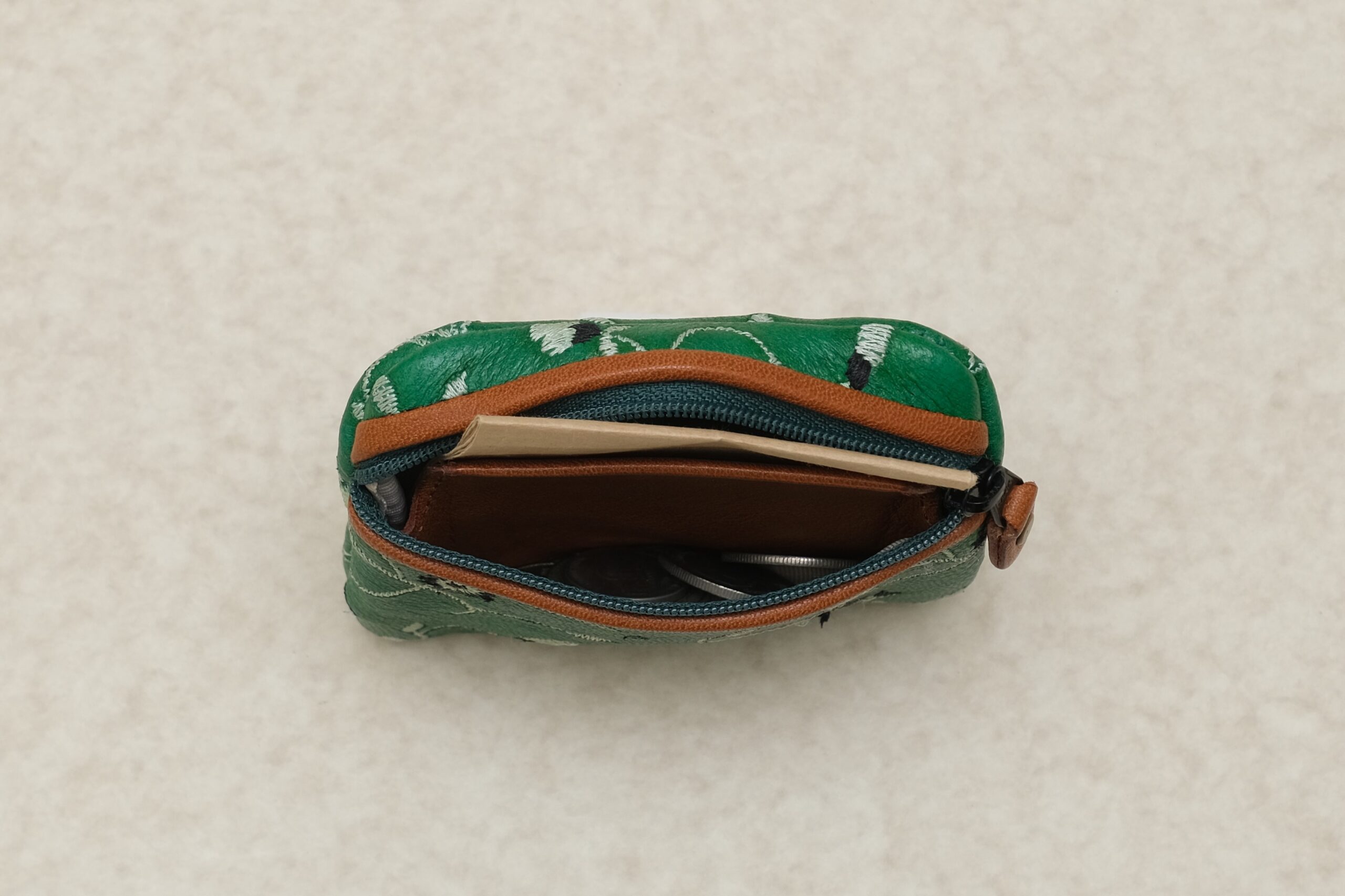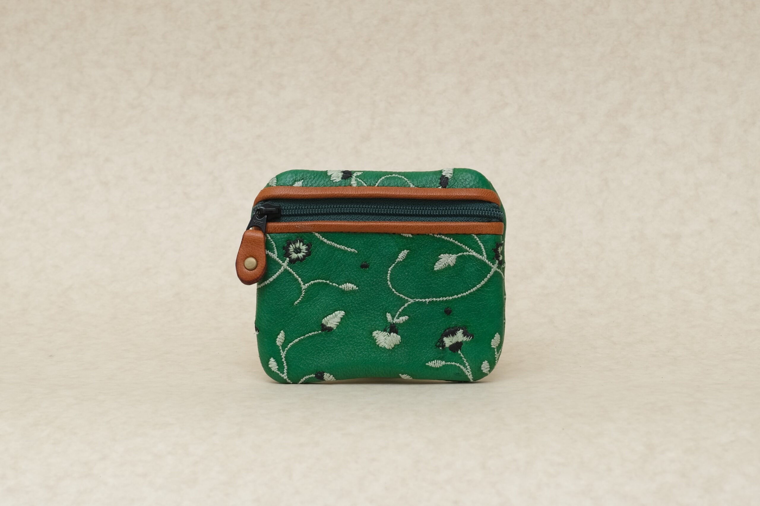 パラダイスグリーンの刺繍革。